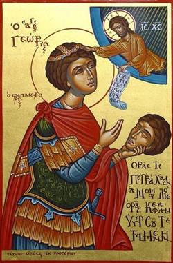 Τῶν Μαρτύρων τὸ κλέος, καὶ λαμπρὸν ἀκροθίνιον, τῶν καινῶν τροπαίων τὴν στήλην, καὶ ὁπλίτης περίδοξον, τιμήσωμεν ἐν ὕμνοις ἱεροῖς, Γεώργιον τὸν μέγαν Ἀθλητήν· σελαγίζει γὰρ τοῖς θαύμασιν πᾶσαν γῆν, καὶ σώζει τοὺς κραυγάζοντας· δόξα τῷ σὲ δοξάσαντι Χριστῷ, δόξα τῷ σὲ μεγαλύναντι, δόξα τῷ ἐνεργοῦντι διὰ σοῦ, ξένα θαυμάσια.