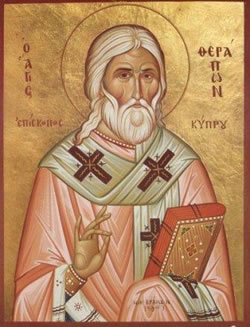 Μετά ἀπό πολλά χρόνια, ἔγινε ἐπιδρομή τῶν Ἀράβων στήν Κύπρο, οἱ ὁποῖοι κατέκαυσαν ὅλα τά Μοναστήρια καί τίς Ἐκκλησίες καί ἔσφαξαν πολλούς κατοίκους τοῦ νησιοῦ. Καί τόν Ἅγιο Θεράποντα τόν συνέλαβαν στήν Ἐκκλησία καί τόν ἀποκεφάλισαν μπροστά στήν Ἁγία Τράπεζα τήν ὥρα πού λειτουργοῦσε στίς 14 Μαΐου. Ξαφνικά, μόλις ἔγινε αὐτό, οὐράνιες μελῳδίες καί ἕνα Ἄκτιστο Φῶς κύκλωσε ὅλο τόν χῶρο τῆς Ἁγίας Τράπεζας. Αὐτό τό θέαμα στούς πιστούς τούς ἔδωσε δύναμη, ἐνῷ στούς Ἄραβες προκάλεσε φόβο καί τύψεις γι’ αὐτό πού ἔκαναν. Τό σῶμα τοῦ Ἁγίου Θεράποντος τοῦ Ἱερομάρτυρα κηδεύτηκε ἀπό τούς πιστούς, ὅπου καί χτίστηκε ὁ πρῶτος Ναός του.