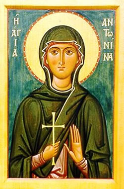 Ἁγία Μάρτυς Ἀντωνίνα καταγόταν ἀπό τήν πόλη Νίκαια τῆς Βιθυνίας καί ἔζησε κατά τούς χρόνους τοῦ αὐτοκράτορα Μαξιμιανοῦ (286 – 305 μ.Χ.). Ὄντας Χριστιανή, φανερώθηκε στόν Μαξιμιανό, ὅταν ἀναχώρησε γιά τήν Νίκαια καί ὁμολόγησε μέ τόλμη γνώμης τόν Χριστό. Γι’ αὐτό βασανίσθηκε καί ὁδηγήθηκε στή φυλακή. Ἀφοῦ τήν ἔβγαλαν ἀπό τή φυλακή, τήν πίεσαν μέ τήν βία νά ἀρνηθεῖ τόν Χριστό. Ἡ Ἁγία δέν δέχθηκε καί παρέμενε σταθερή στήν πίστη της. Τότε οἱ δήμιοι τήν κρέμασαν καί τῆς ἔγδαραν τά πλευρά. Ἔπειτα τήν τοποθέτησαν πάνω σέ πυρακτωμένη σχάρα, ἀλλά καί μετά ἀπό αὐτό τό μαρτύριο ἡ Ἁγία παρέμεινε ἀβλαβής.